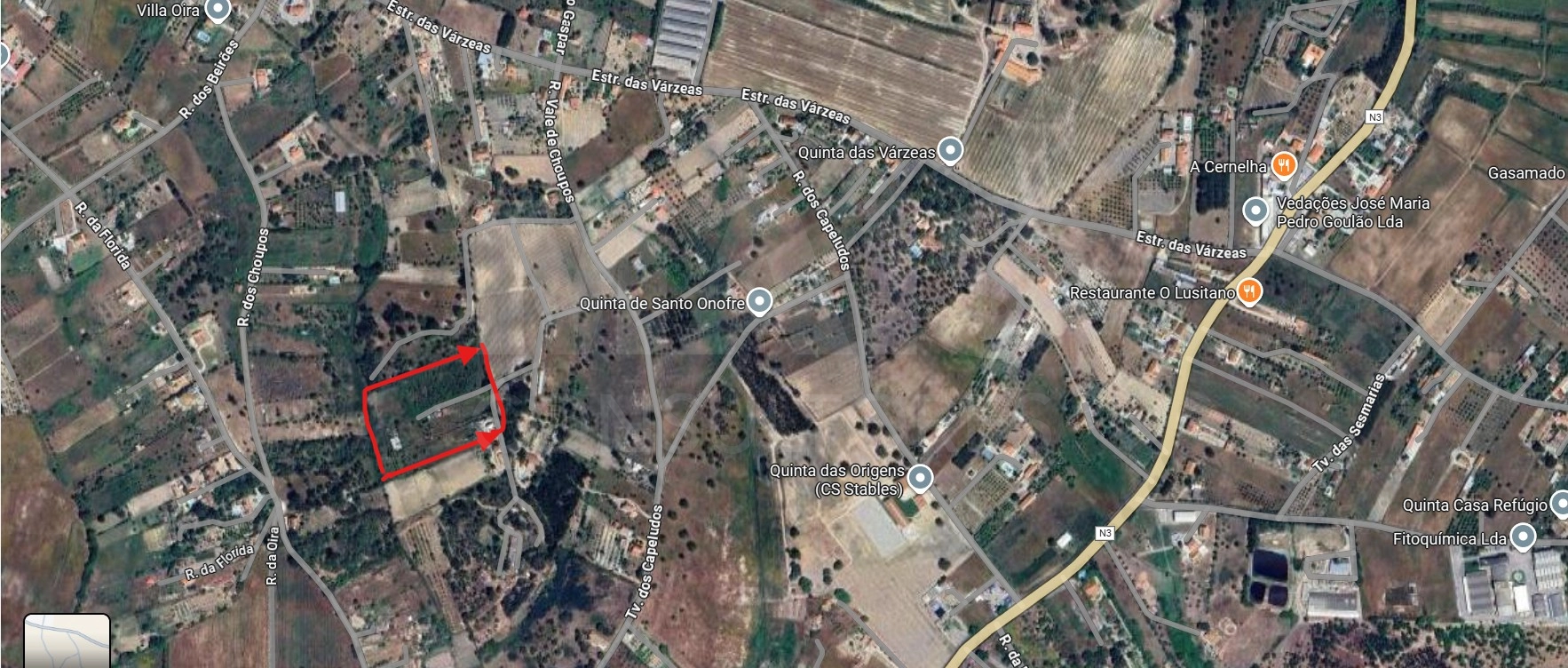O terreno tem furo de água, proporcionando o abastecimento de água canalizada na moradia através de uma bomba de água e eletricidade da rede pública. A moradia existente neste terreno tem dois pisos, o rés-do-chão é constituído por duas boxes. No 1º piso temos uma marquise/sala, cozinha e três quartos e um wc com banheira, tem sótão e o telhado uma estrutura sólida. Não tem licença de habitação. A propriedade tem dois anexos para arrumos e guarda de utensílios agrícolas.